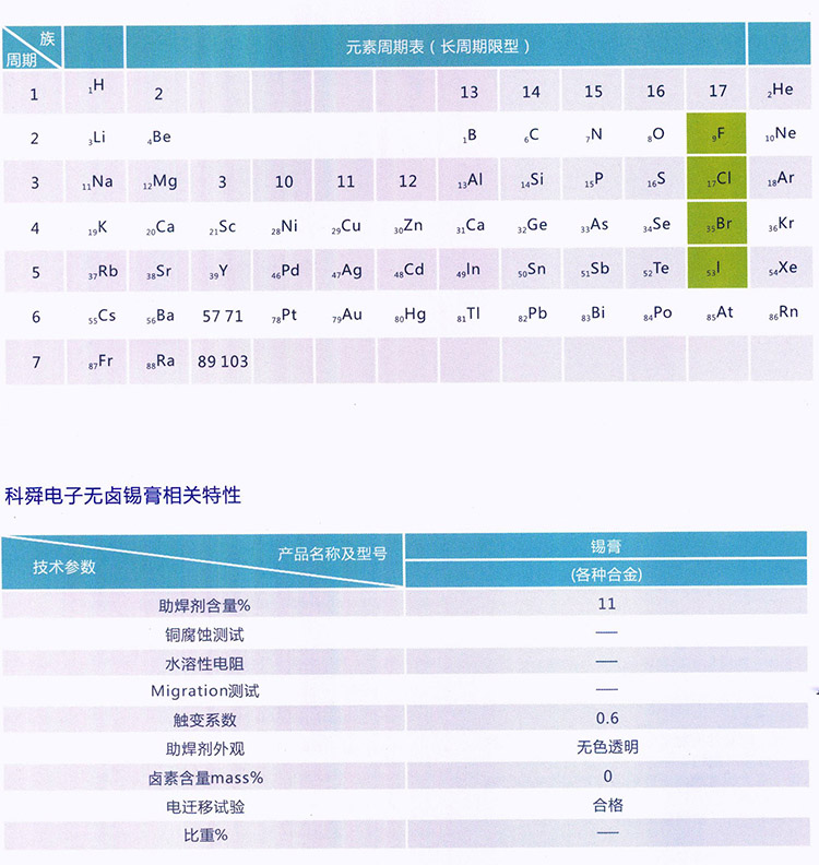 近年来,环境污染问题已经引起世界高度的关注,对于身边使用的产品均要求更高的安全性与零污染。作为助焊剂组成材料中的活性成份而添加的卤化物具有保护焊锡表面以及锡盘不被氧化等作用。但这些卤化物具有很强的毒性,影响人的呼吸系统,燃烧会释放出的卤素气体,与水蒸汽结合时,会生成腐蚀有害气体(卤化氢),对一些设备及建筑物造成腐蚀,严重威胁人类健康和生态环境。如此,对于电子辅料助焊剂及含助焊剂的焊锡材料(如:锡膏、锡线)将面临巨大挑战。为了适应行业发展和国际上已有部分地区颁布的相关法律禁令,所以无卤的推行势在必行。什么是卤素:卤素为非金属元素,包括氟(F)、氣CI)、澳(Br)、碘(I)、砹(At)五种元素。无卤的行业标准:助焊剂中氣(F)、氯(CI)、溴(Br)的含有量均在900ppm以下,三者的总含量在1500ppm以下。无卤的一般检测项目:氟(F)、氣(C1)、澳(Br)、碘(I),检测仪器一般采用离子色谱法进行检测。